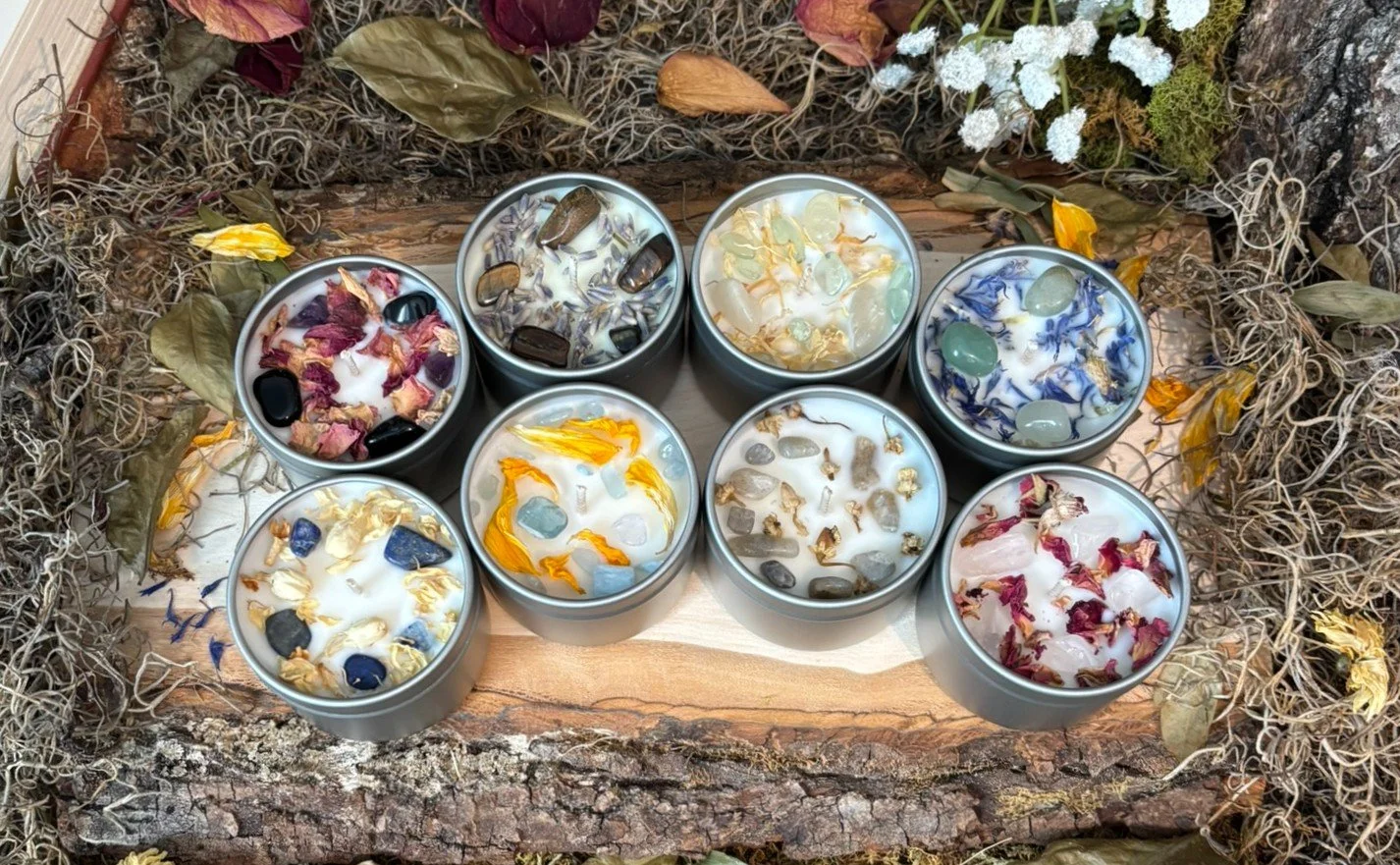 In 2019 I set out to make beautiful, non-toxic candles for families like mine who are sensitive to common ingredients. Each hand-poured soy candle and skincare product is made with carefully chosen, safe ingredients: nourishing butters and oils, natural essential oil blends, and phthalate-free fragrance oils. Then I add a little alchemy — healing crystals, herbs, dried flowers, and intention — so every flicker and every bath becomes a quietly magical ritual.